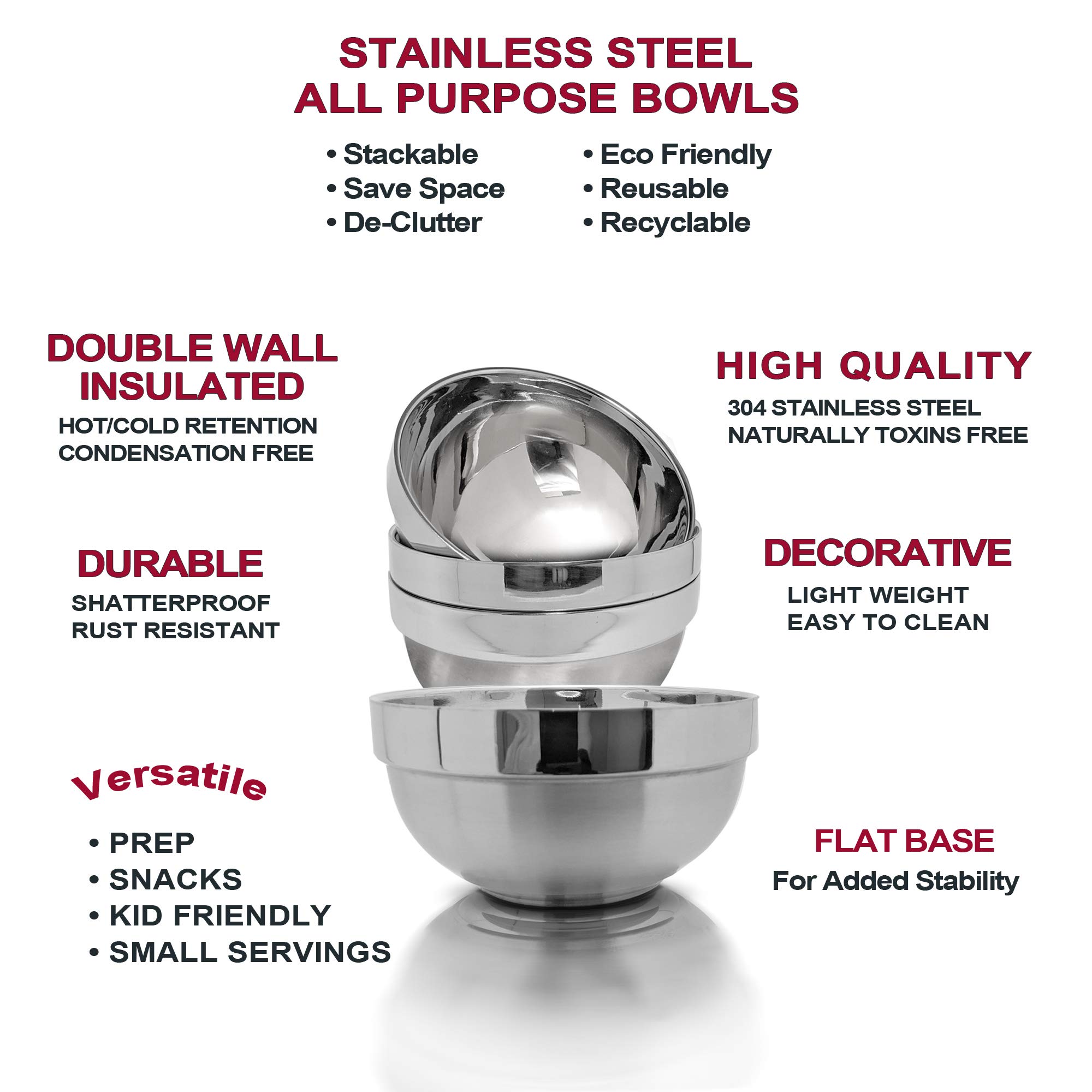 Amazon Com Heat Insulated 304 Stainless Steel Bowls Double Walled Multipurpose Rice Ice Cream Kids Snacks 4 Pack Small 16 Oz Home Kitchen